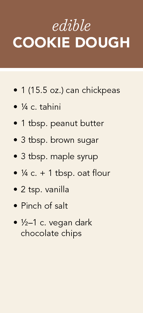 Drain, rinse and dry the chickpeas with a paper towel. Add the chickpeas, tahini, peanut butter, brown sugar, maple syrup, oat flour, vanilla and salt to a food processor and process for 5 minutes, until smooth.