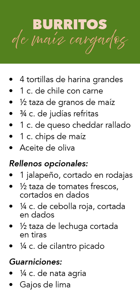 De una en una, rellena cada tortilla colocando uniformemente el chile, el maíz, las judías, el queso, los trocitos de maíz y el relleno que prefieras, dejando espacio cerca de los bordes. Dobla los lados derecho e izquierdo, luego dobla el lado más cercano a ti sobre la parte superior de los ingredientes, metiéndolo suavemente. Enrolla bien el burrito alejándolo de ti para terminar.