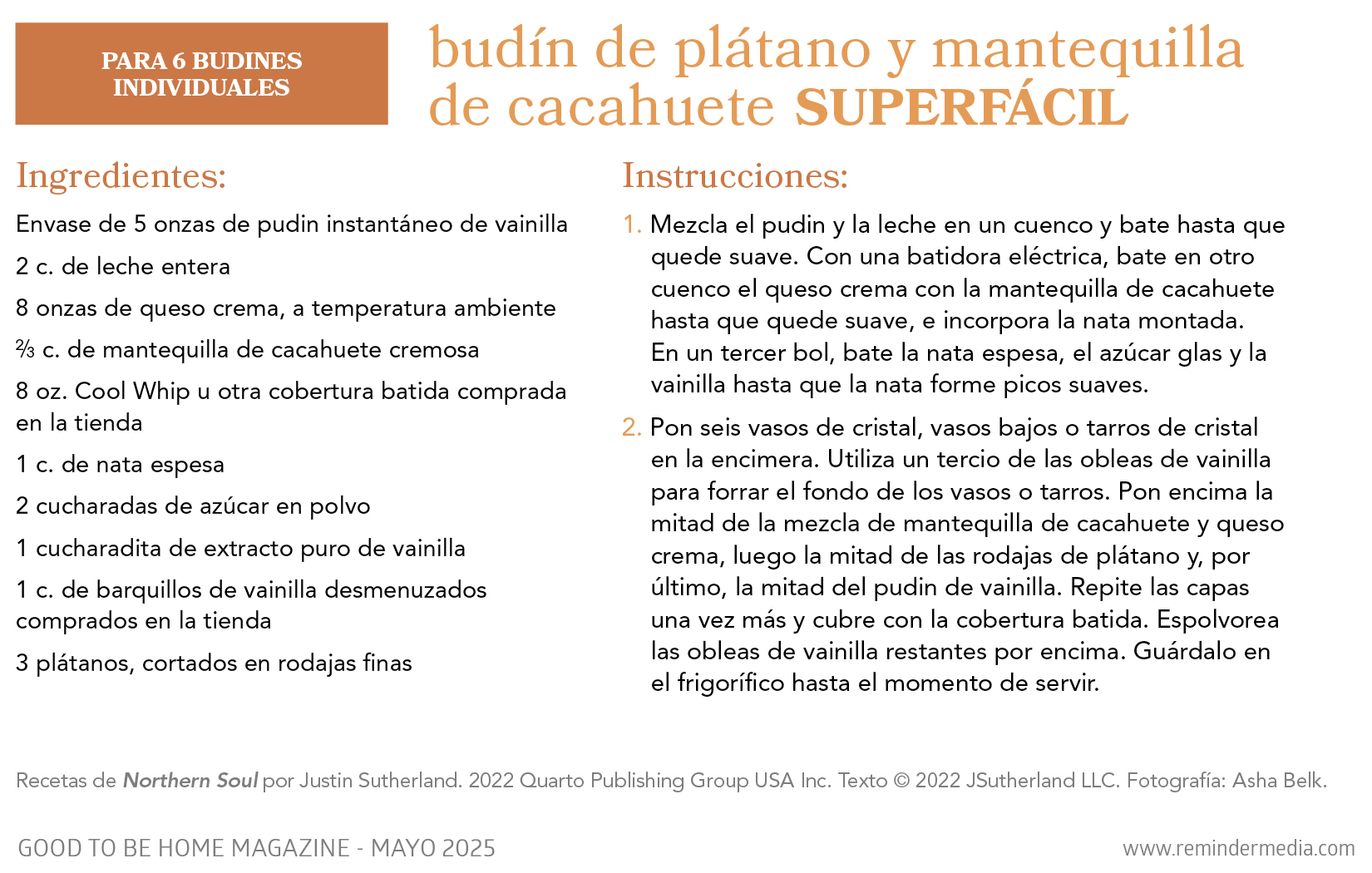 Pon seis vasos de cristal, vasos bajos o tarros de cristal en la encimera. Utiliza un tercio de las obleas de vainilla para forrar el fondo de los vasos o tarros. Pon encima la mitad de la mezcla de mantequilla de cacahuete y queso crema, luego la mitad de las rodajas de plátano y, por último, la mitad del pudin de vainilla. Repite las capas una vez más y cubre con la cobertura batida. Espolvorea las obleas de vainilla restantes por encima. Guárdalo en el frigorífico hasta el momento de servir.