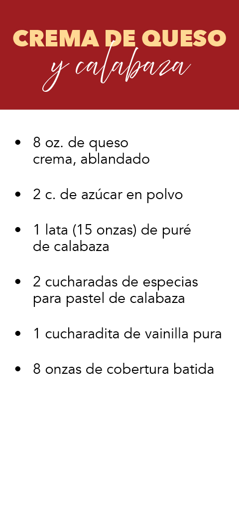 En un bol, añade el queso crema, el azúcar, el puré de calabaza, la especia para tartas y la vainilla. Remueve hasta que quede suave.