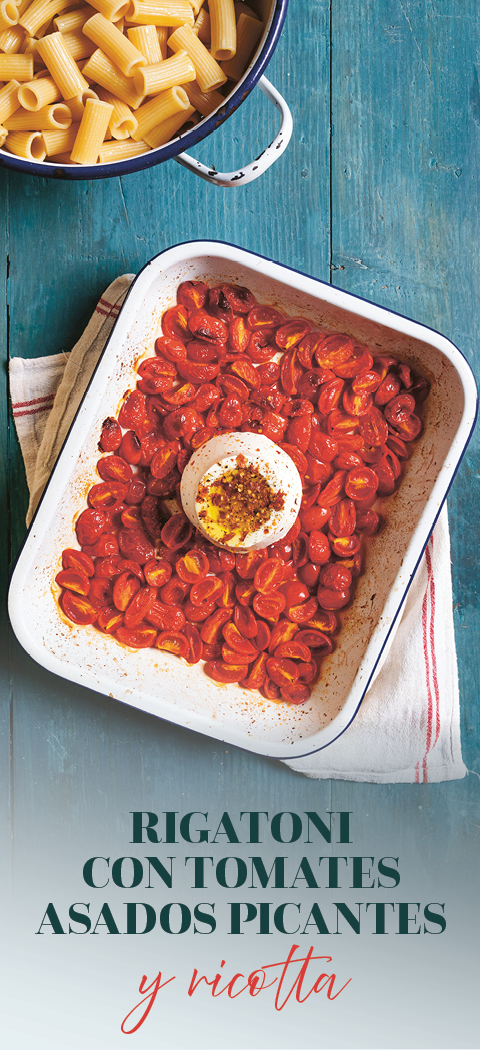 Retira los tomates y la ricotta del horno. Añade los rigatoni escurridos, el parmesano, la albahaca y el aceite de oliva restante y remueve suavemente para mezclar, con un chorrito de agua de la pasta si es necesario. Lleva el plato a la mesa y sírvelo inmediatamente.