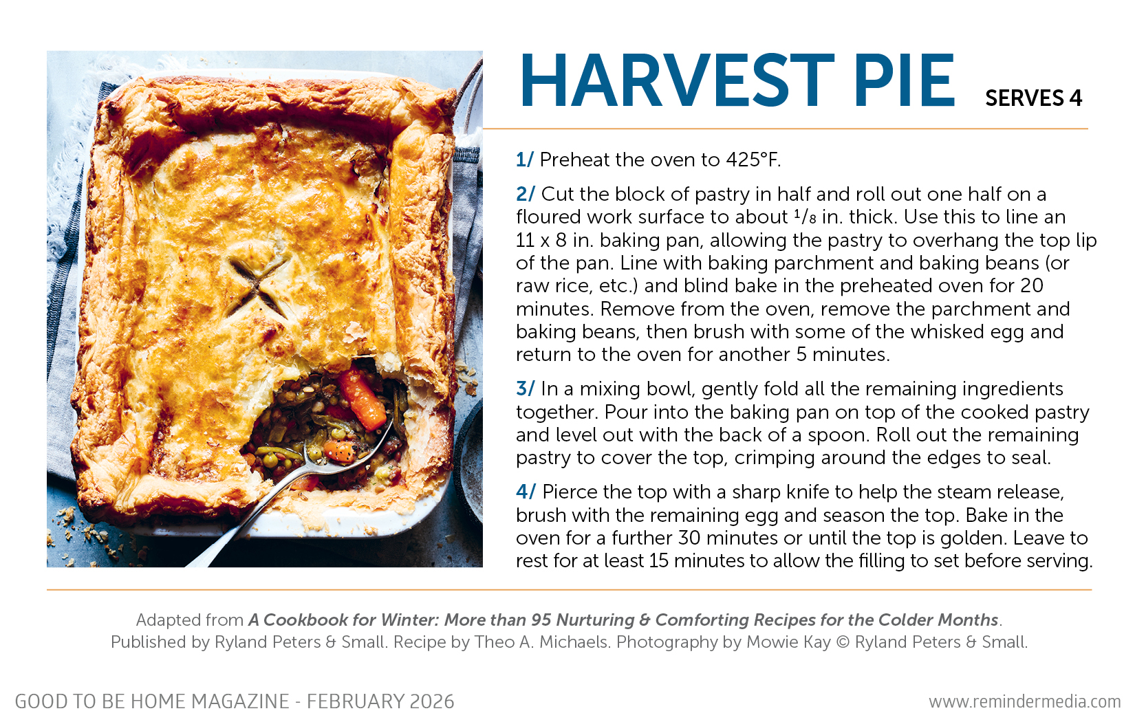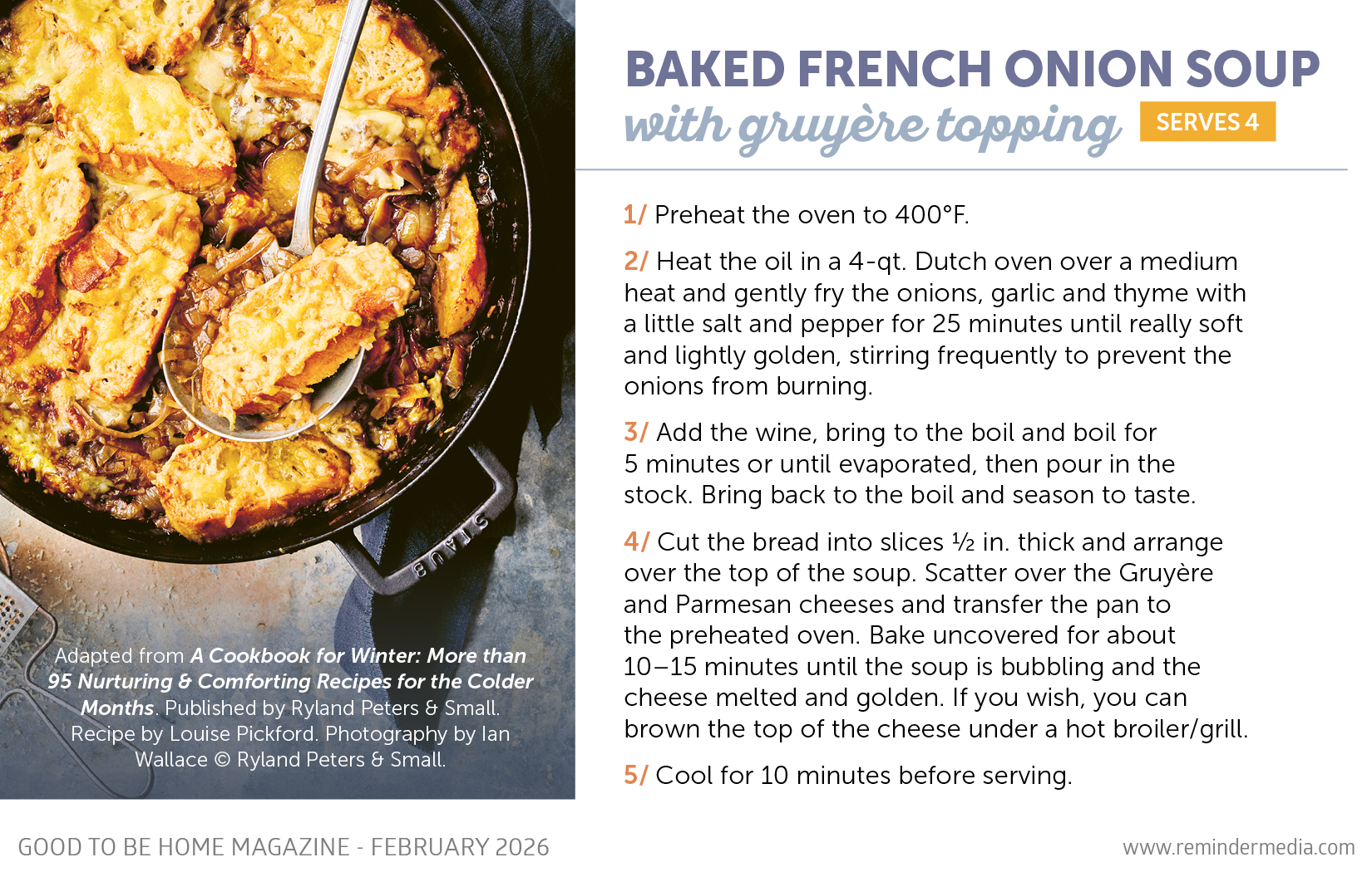 Of course, February wouldn’t be complete without some cozy comfort food. Inside, you’ll find two savory recipes that are perfect for chilly evenings: a baked French onion soup and a hearty harvest pie. Both are sure to warm you from the inside out.