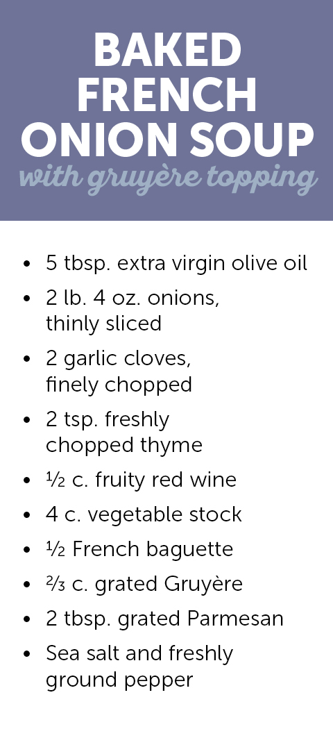 Slowly braised onions are truly one of life’s pleasures, especially in this classic, comforting soup, with its topping of melted cheese.