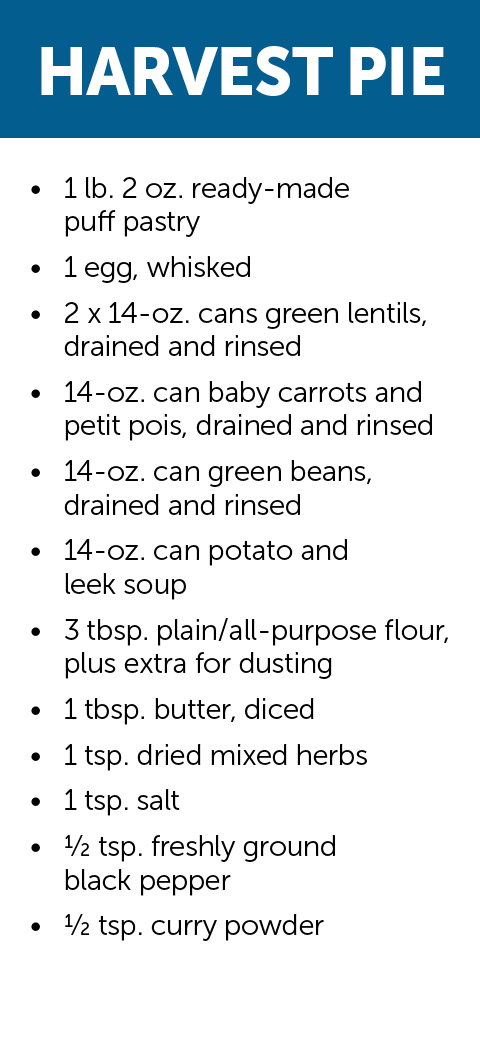 This harvest pie is packed with canned lentils and vegetables and uses potato and leek soup to bring everything together for a hearty and savoury supper. If you were short on time, you can mix the filling directly in the pastry case and just top with a pastry lid, then into the oven for a quicker fix.