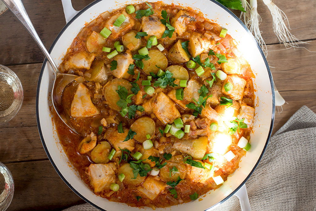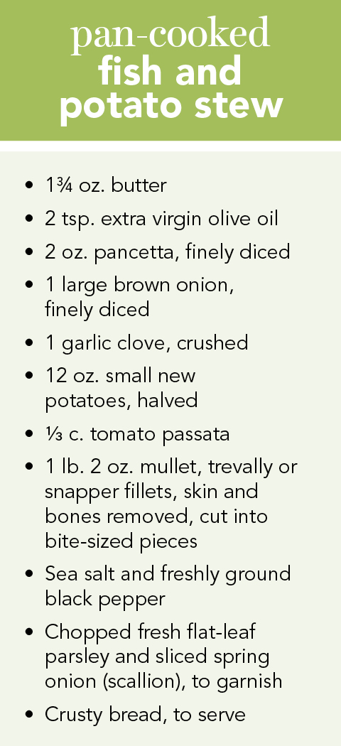 In his online recipe booklet Ricette di Cucina delle ‘Acque di Mezzo’ Sandro Bignami describes some of the dishes of the lowlands, combining elements of the land and the sea. This recipe is taken from the book, slightly tweaked. It’s one of those one-pot dishes that make cooking for a group so easy. Pancetta, onions and butter are slowly braised to make a well-seasoned base for baby potatoes and bites of tender fish. Serve from the pan at the table, adding a good sprinkling of parsley and spring onion at the end.