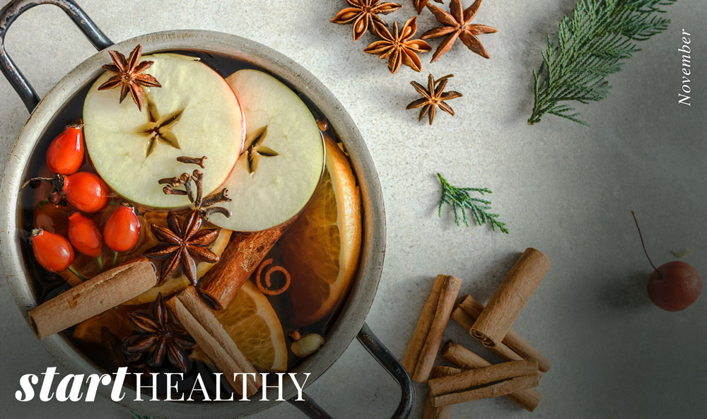 Welcome to the holiday season, a period known for its memorable family gatherings, heartwarming meals, and dazzling decor—as well as the avalanche of stress that can often come with planning all that. So why not make it your mission to breathe easy this time around? This issue of Start Healthy is packed with solutions that could take some effort out of the days ahead.