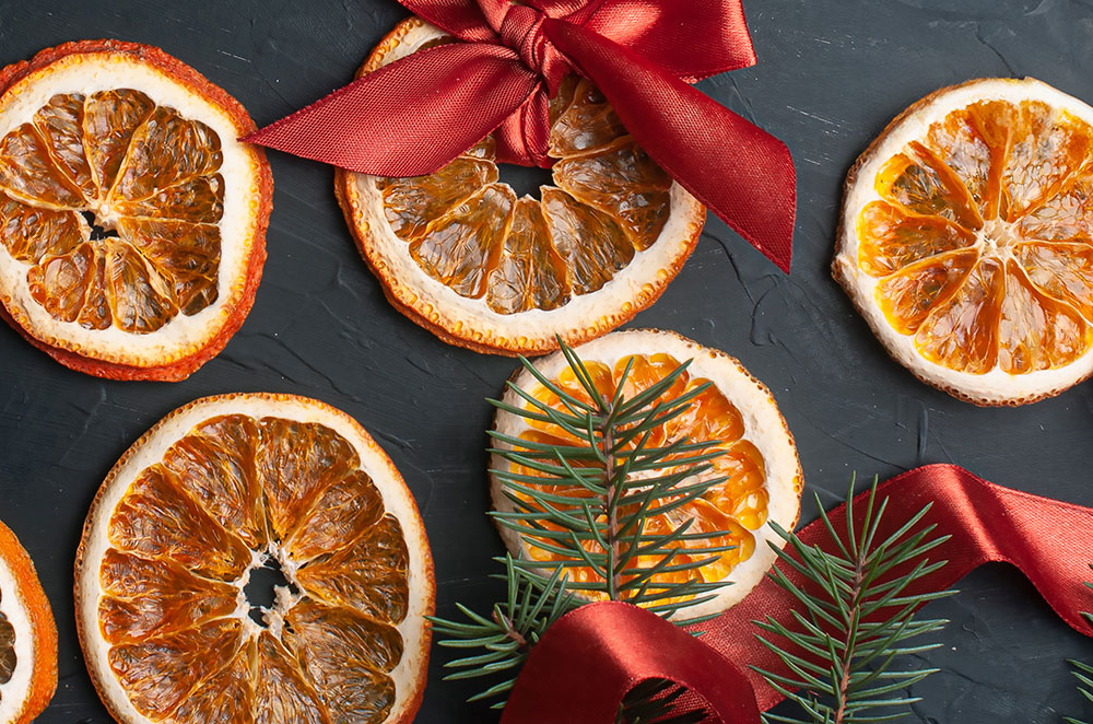 Alternatively, you can use those dried oranges to make a holiday wreath for your door or wall—all you need is a hot-glue gun and a wooden or bamboo floral hoop. Start by applying a drop of the adhesive to the surface, then firmly press a slice on it. Continue adding more in the same fashion, allowing them to overlap slightly, until your form is totally covered. Finish by adding a festive ribbon at the top to serve as a hanger and offer an extra touch of decoration.