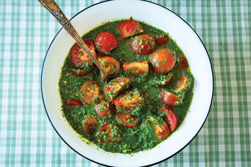 The combination of fresh herbs, jalapeño, garlic, and vinegar creates a sharp and aromatic sauce that perfectly complements the juicy tomato halves.