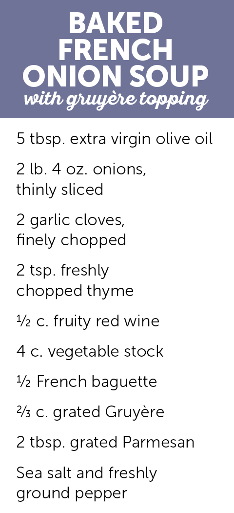 Slowly braised onions are truly one of life’s pleasures, especially in this classic, comforting soup, with its topping of melted cheese.